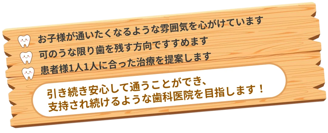 お子さまの歯の健康を守るために、やさしく丁寧に診療します。怖くない雰囲気づくりを大切にし、楽しく通える歯医者さんを目指しています。